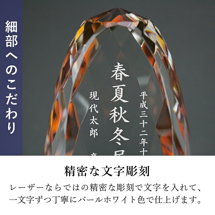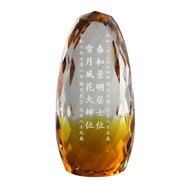 おしゃれなガラス位牌です。光の反射と屈折の美しさを最大限に引き出したモダンデザイン。コンパクトなので小さいミニ仏壇に合わせやすく、戒名のない無宗教の手元供養にもおすすめです。文字入れを別途承ります。位牌本体と同じカートで文字入れをご注文ください。天台宗・真言宗・日蓮宗・浄土宗・浄土真宗本願寺派(西本願寺)・真宗大谷派(東本願寺)・臨済宗・曹洞宗の全宗派、無宗教に対応。日本製「エリプス アンバー」現代仏壇