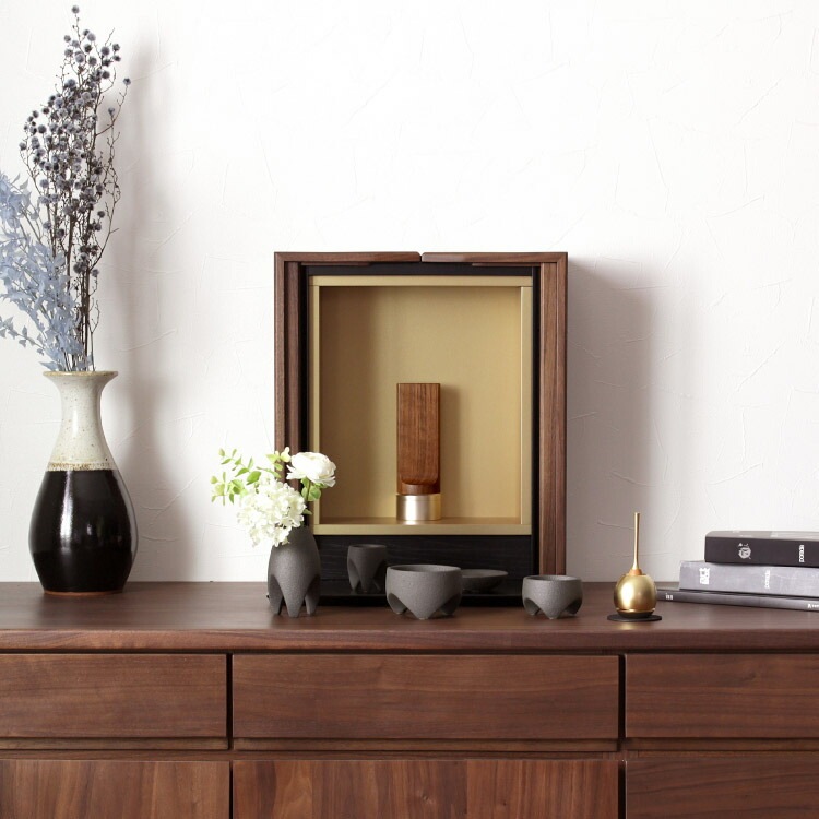 - おしゃれでモダン位牌です。シャンパンゴールドの台座内部に小さな品を納められます。夫婦位牌の名入れもできるのでミニ仏壇やコンパクトな手元供養にも最適です。