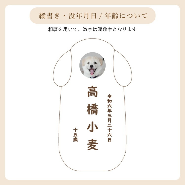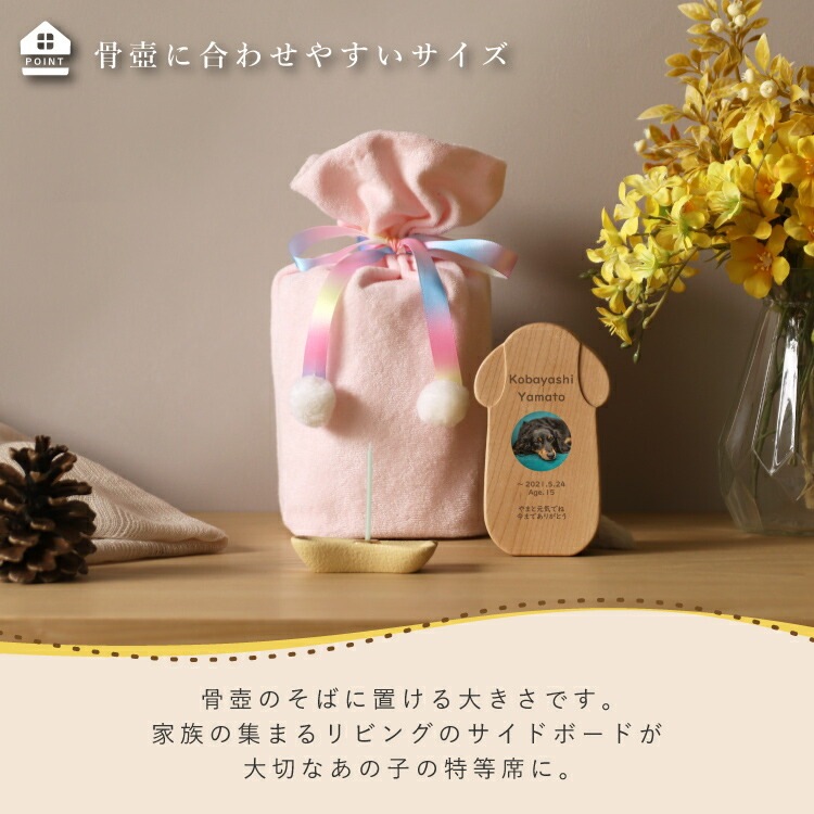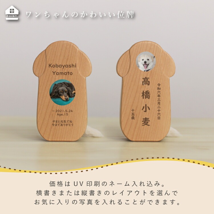 - かわいい犬型のペット位牌です。小さいので仏壇や骨壺、メモリアルグッズのそばに置きやすく、大切なワンちゃんを本格的にペット供養できます。名入れ代込み。