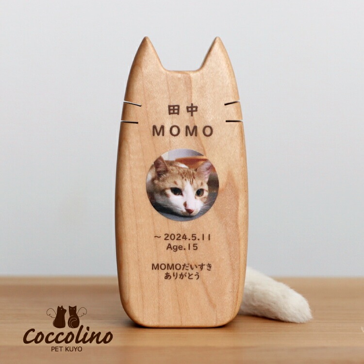 かわいい猫型のペット位牌です。小さいので仏壇や骨壺、メモリアルグッズのそばに置きやすく、大切なネコちゃんのお名前と写真を入れて本格的にペット供養できます。名入れ代込み。送料無料「ピコ ミーチョA」コッコリーノ Coccolino