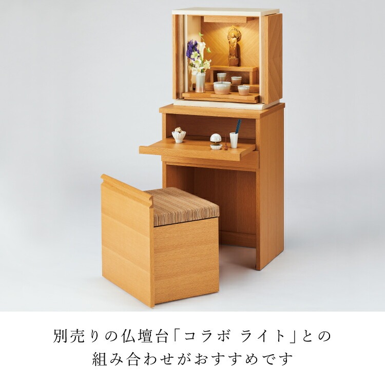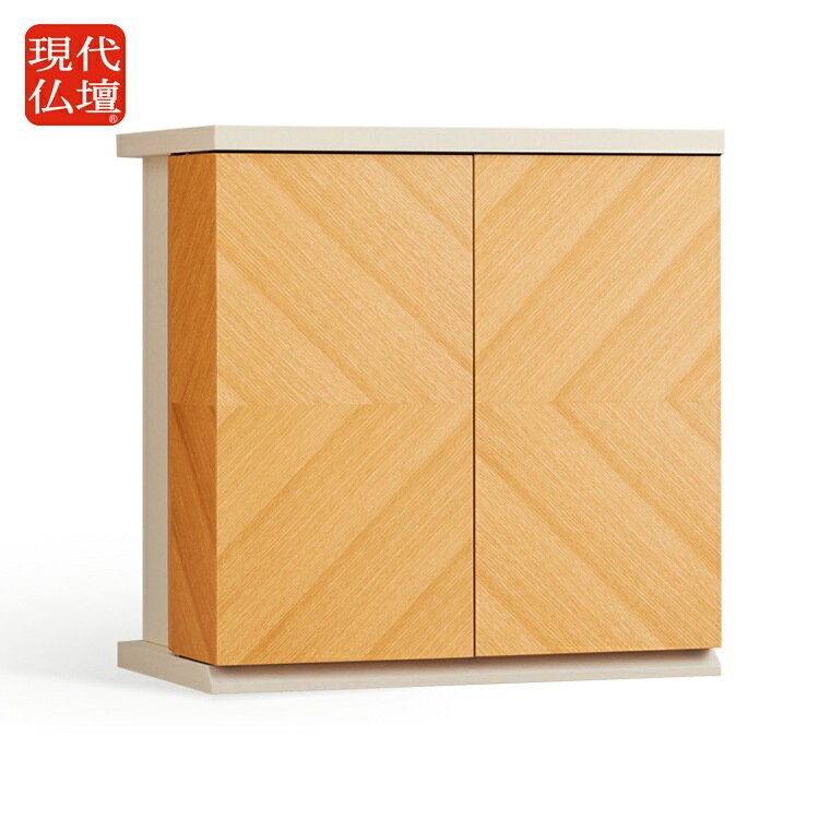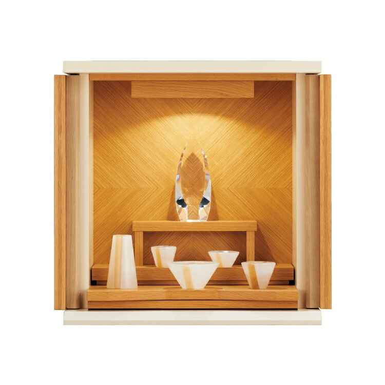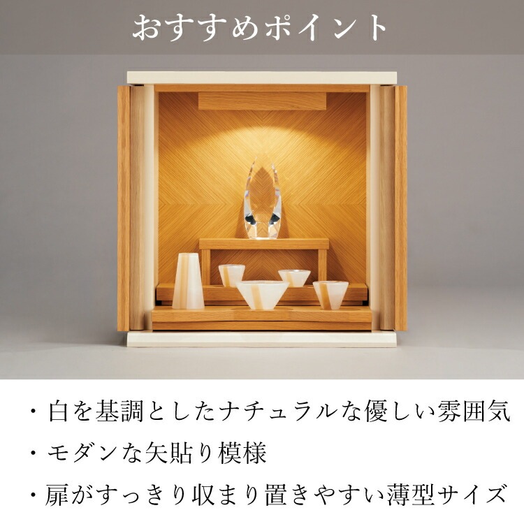 - 矢貼り模様がおしゃれなモダン仏壇です。扉がコンパクトに折り畳めて両側に収まるのでリビングやマンションに置きやすく、日本製ならではの丁寧な仕上がりです。
