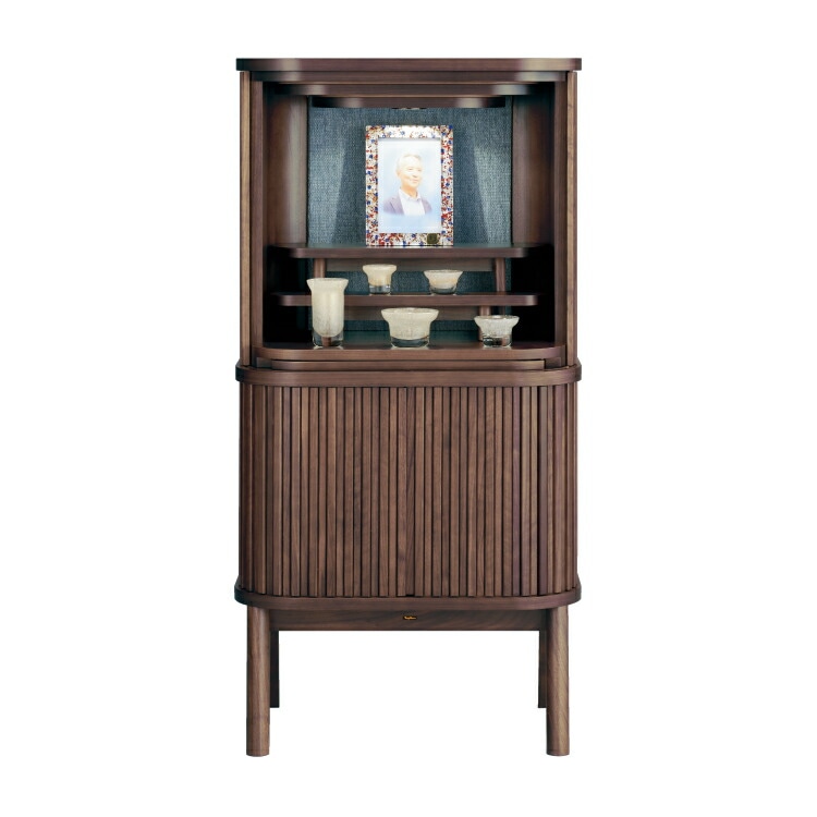 おしゃれなモダン仏壇です。シンプルで温かみのある北欧デザイン。日本製ならではの精緻な巻き戸が両側へコンパクトに収まり、リビングやマンションをワンランク上のインテリア空間に演出します。天台宗・真言宗・日蓮宗・浄土宗・浄土真宗本願寺派(西本願寺)・真宗大谷派(東本願寺)・臨済宗・曹洞宗の全宗派対応 奨励位牌4.5寸 送料無料 「スフレ ウォールナット」 現代仏壇 【5年保証】