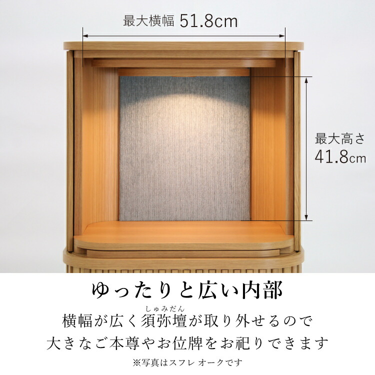 - おしゃれなモダン仏壇です。日本製ならではの精緻な巻き戸は側面に沿ってコンパクトに開閉し、リビングやマンションをワンランク上のインテリア空間に演出します。