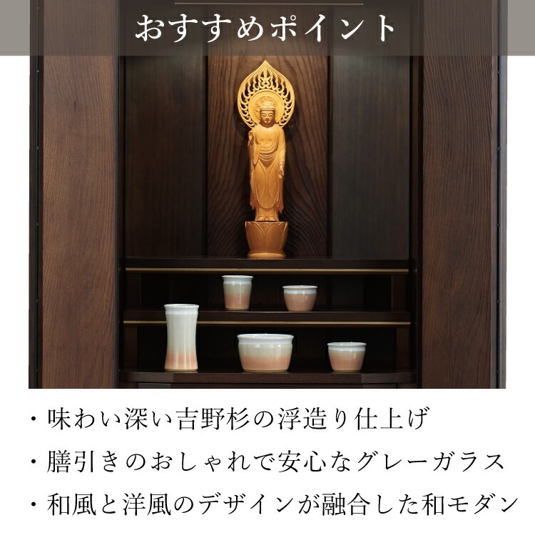 - おしゃれなモダン仏壇です。日本製ならではの丁寧な作りで木目を際立たせる浮造りを施しました。リビングやマンションのインテリアに木のぬくもりをプラスします。
