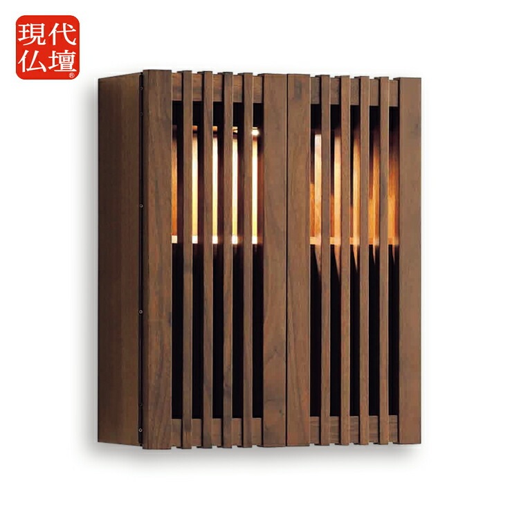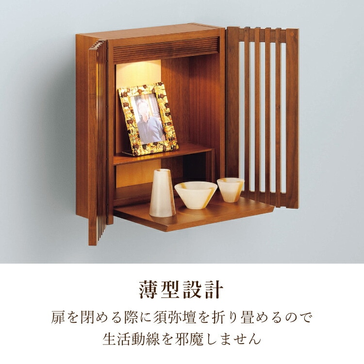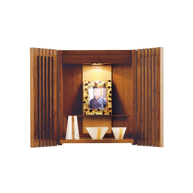 - モダンな壁掛け仏壇です。リビングやマンションに溶け込み、おしゃれなインテリア空間を演出します。日本製ならではの格子扉が内と外の空間を優しくつなぎます。