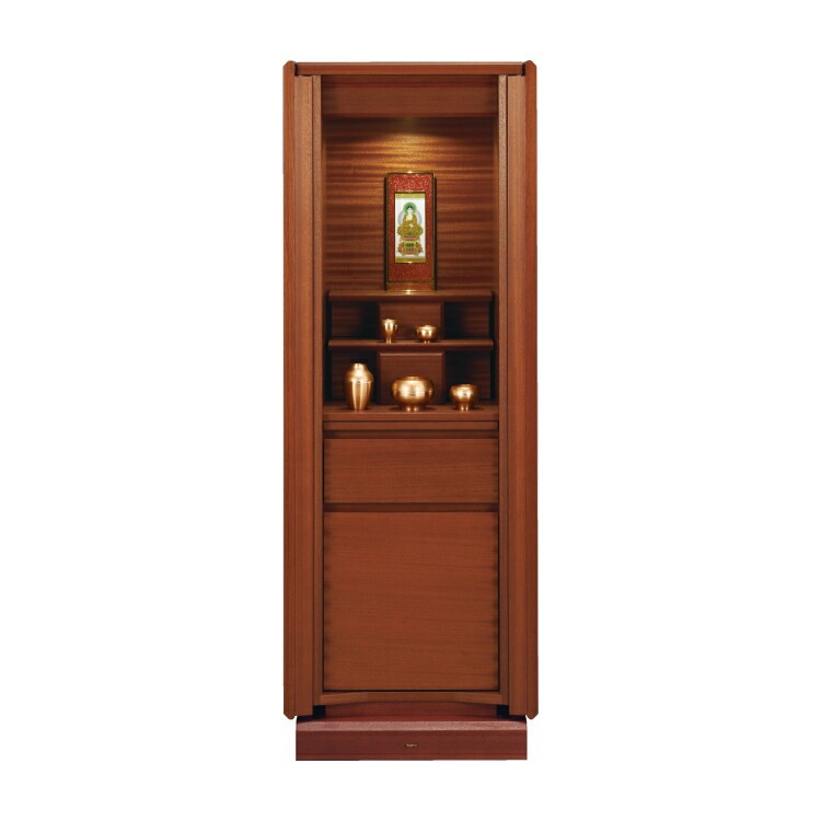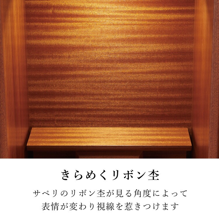 - おしゃれなモダン仏壇です。扉がコンパクトに収まるのでリビングやマンションに置きやすく、サペリ材特有のリボン杢が輝いて上品なインテリア空間を演出します。