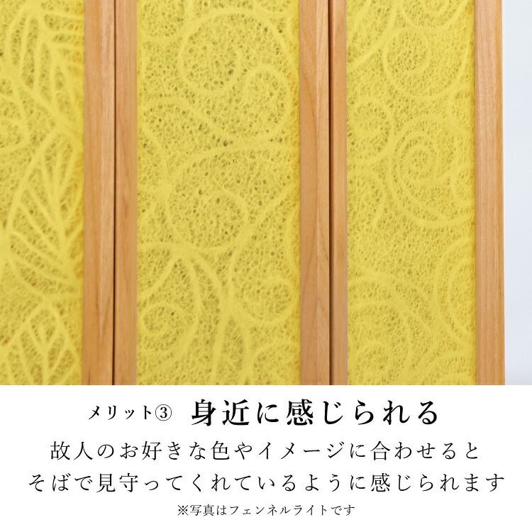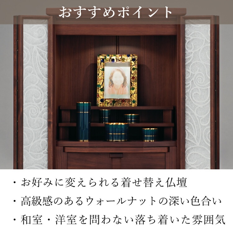 - おしゃれなモダン仏壇です。コンパクトな上置き仏壇なのでリビングやマンションに置きやすく、安心の日本製。インテリアに合わせて扉の中身を入れ替えられます。