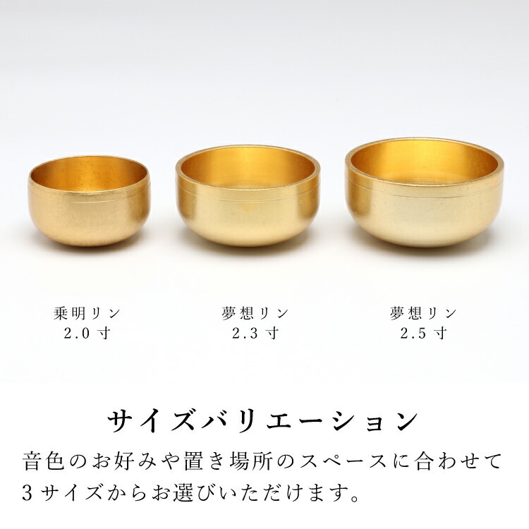 シンプルな形のおりんです。モダン仏壇にも伝統型仏壇にも合います。富山県の高岡銅器で制作された安心の日本製。チーンと澄んだ音色が心地よく響きます。りん棒とりん台は別売りです。送料無料「夢想リン 2.3寸 本金光彩」現代仏具
