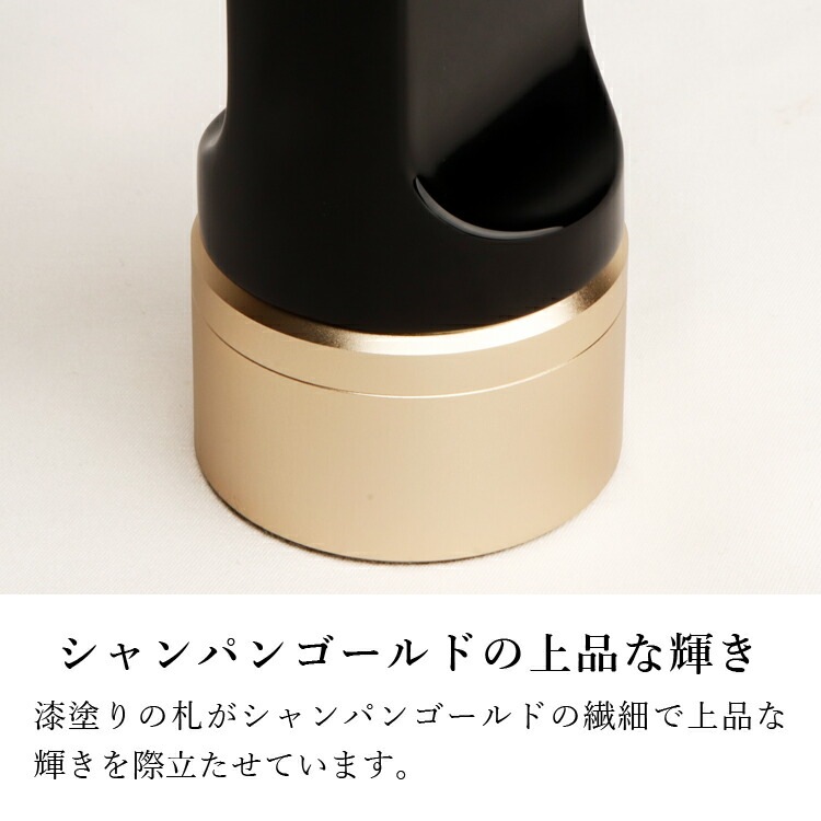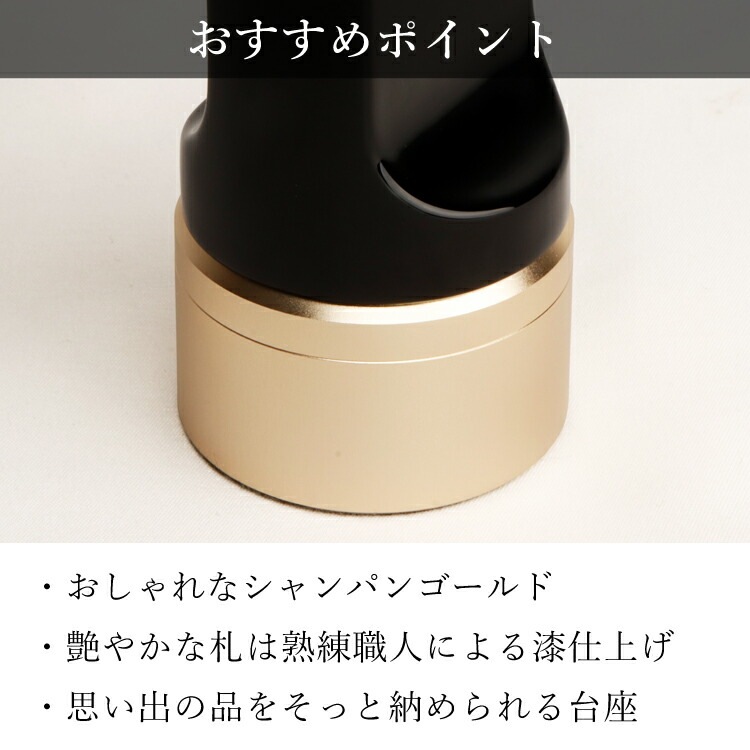 - おしゃれでモダン位牌です。シャンパンゴールドの台座内部に小さな品を納められます。夫婦位牌の名入れもできるのでミニ仏壇やコンパクトな手元供養にも最適です。
