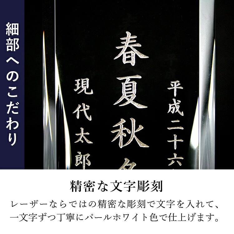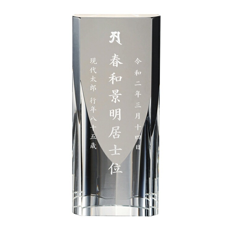 - おしゃれなガラス位牌です。光の反射と屈折の美しさを最大限に引き出したモダンデザイン。戒名のない無宗教の手元供養にもおすすめです。文字入れ代別途。