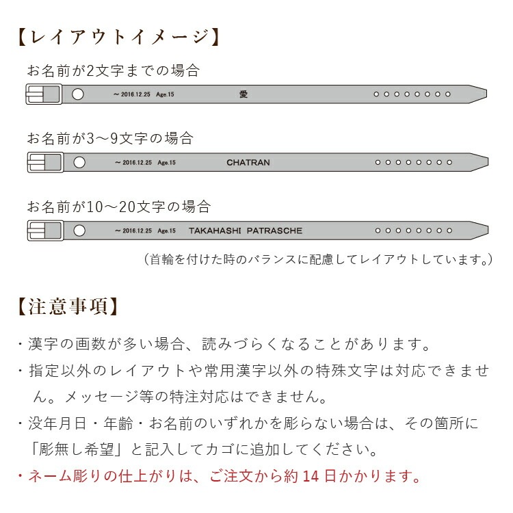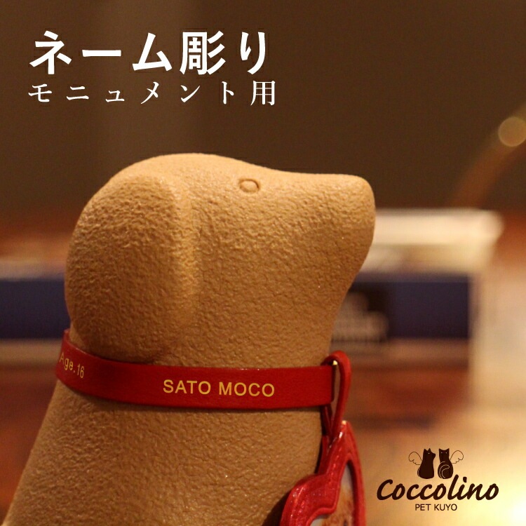 首輪にネームを彫って、世界にただひとつのオンリーワンに。「ずっと忘れないよ。」そんなご家族さまの想いを込めて、ひとつひとつ大切に彫らせていただきます。 ※骨つぼモニュメントを同時に注文される方が対象です。 ※首輪ネーム彫りは1つの骨つぼモニュメントに対して、1回ご注文いただけます。 ※骨つぼモニュメント、ネーム彫りを2つ以上ご購入の方は、購入画面の備考欄で、商品毎に彫るお名前の設定をご連絡ください。