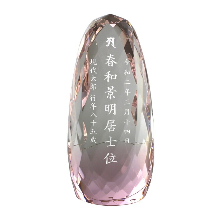 おしゃれなガラス位牌です。光の反射と屈折の美しさを最大限に引き出したモダンデザイン。コンパクトなので小さいミニ仏壇に合わせやすく、戒名のない無宗教の手元供養にもおすすめです。文字入れを別途承ります。位牌本体と同じカートで文字入れをご注文ください。天台宗・真言宗・日蓮宗・浄土宗・浄土真宗本願寺派(西本願寺)・真宗大谷派(東本願寺)・臨済宗・曹洞宗の全宗派、無宗教に対応。日本製「エリプス チェリー」現代仏壇