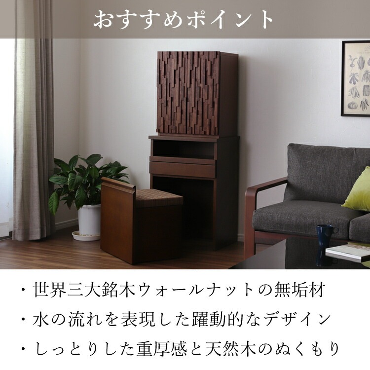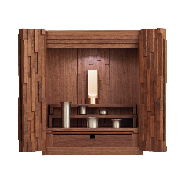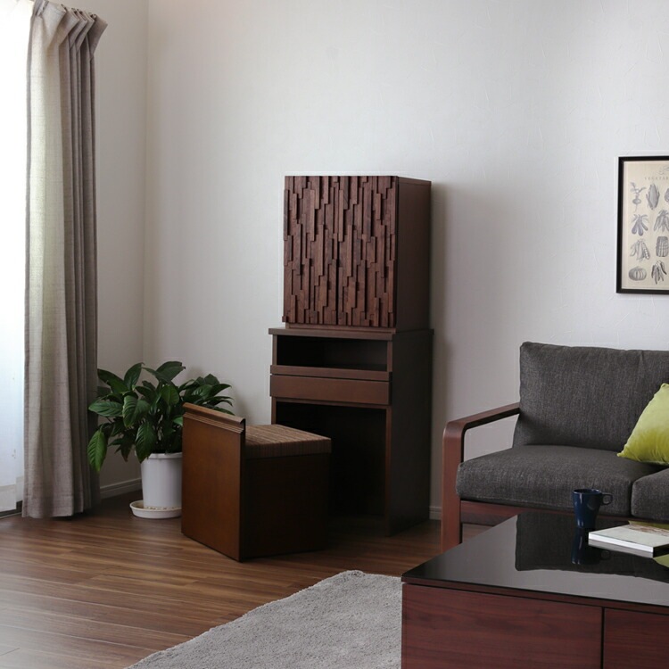 - おしゃれなモダン仏壇です。コンパクトな上置き仏壇なのでリビングやマンションに置きやすく、日本製ならではの細やかな作りの扉に木のぬくもりが感じられます。