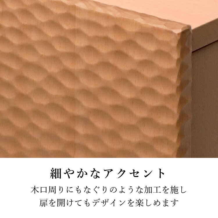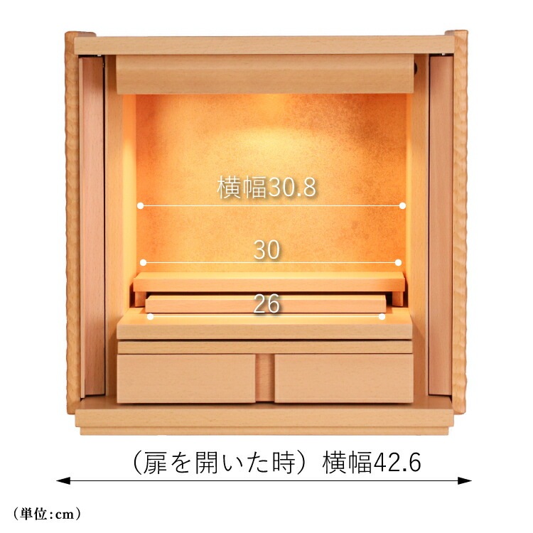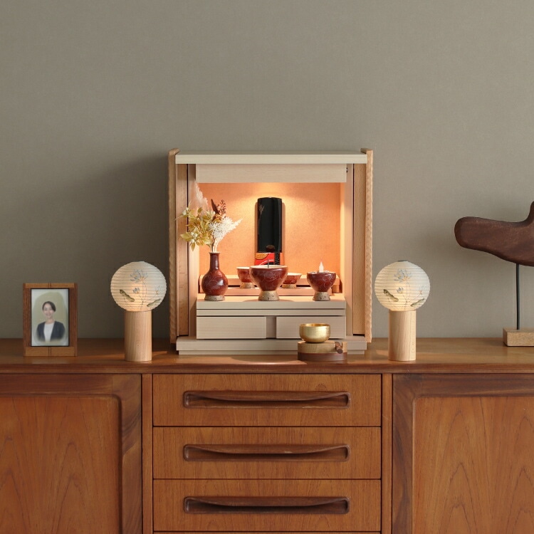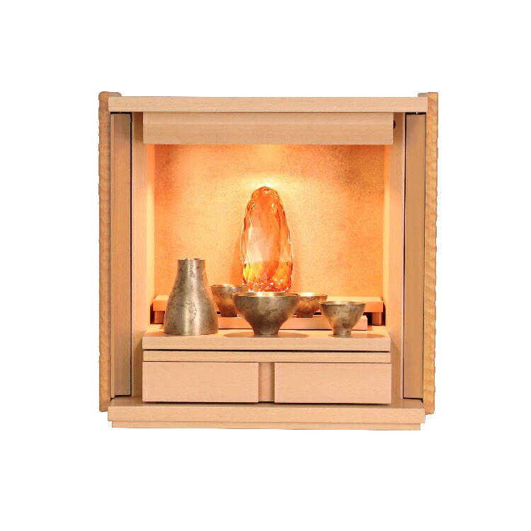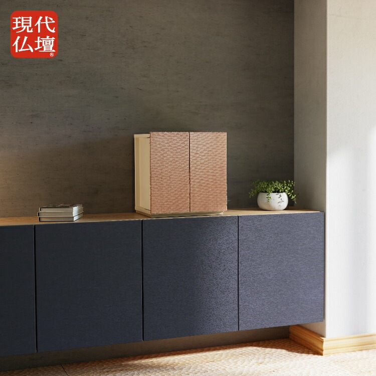 - おしゃれなモダン仏壇です。リビングやマンションに置きやすいミニ仏壇。小さいながら日本製ならではの細やかな作りで、扉の波模様は職人がノミで削り出しました。