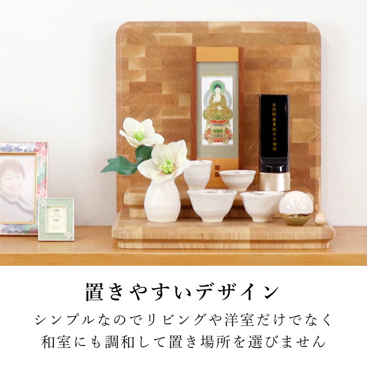 - おしゃれなオープンタイプのミニ仏壇。天然木ホワイトオークの温かみが感じられます。小さいサイズでシンプルなデザインだから置き場所を選びません。